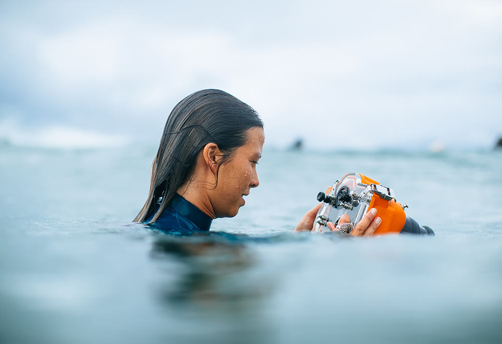 In the water, it isn't as easy to change settings due to the limitations of having an enclosed housing around your camera and being in such an extreme changing environment. Waves crashing around you, people surfing towards you—amongst all that you need to take a photo!