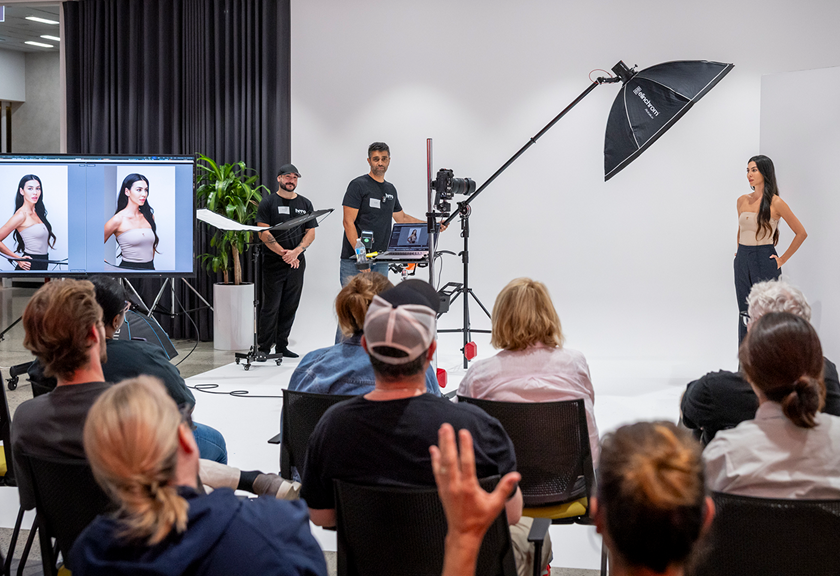 Studio 1 is a multi-functional space designed for a range of creative needs. It features a large corner cyclorama (41m²) ideal for photo shoots, a large-format printing station, and a product wall showcasing Canon cameras and lenses. With its generous size, the studio lends itself well to hosting events, workshops, and product demonstrations.
