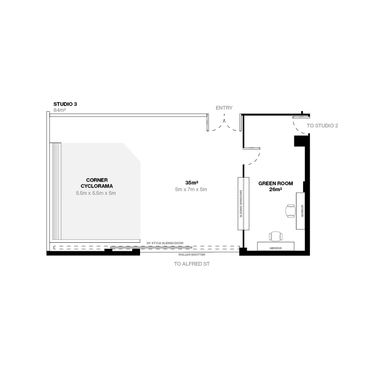 Studio 3 is our newest studio. The green room is 26 square meters featuring a hair and make-up table, clothing rack, iron & ironing board, and has direct access to Studio 2, allowing for privacy when booking both studios. Ideal for both photography and video productions, the white cyclorama measures 7.5m x 7.5m and allows the flexibility to shoot from multiple angles. The studio also features a New York style barndoor to allow an abundance of natural light.