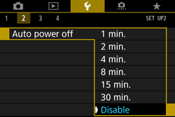 Under the [ ] tab, set [Auto power off] to [Disable] as necessary.