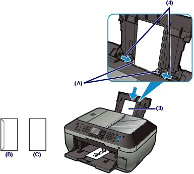 (3) Slide the Paper Guides (A) to open them, and load the envelopes in the center of the Rear Tray WITH THE ADDRESS SIDE FACING YOU.