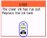 | Refer to "Replacing Ink Tanks" If you continue printing under the clear ink out condition, see ""The clear Ink has run out. Replace the ink tank." U165/U166" and take appropriate action. When the clear ink hasrun out, printing on plain paper from the Cassette is not possible. The fax, which is received under the clear ink out condition, will be stored in memory. |
