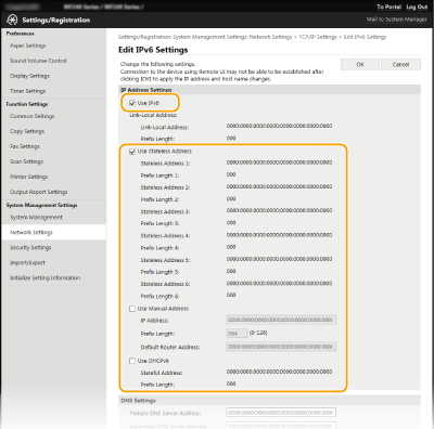 The IPv6 addresses of the machine can be configured via the Remote UI. Before setting IPv6 addresses, check the IPv4 address settings. You need to set the correct IPv4 settings to use IPv6 addresses. Note that the scan function that uses the scanner driver or MF Scan Utility is not available in an IPv6 environment. The machine can use up to nine of the following IPv6 addresses: