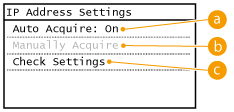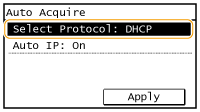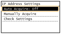 Select to automatically assign an IP address via a protocol such as DHCP. When ⋖Auto Acquire: On⋗ is displayed, automatic addressing is enabled.