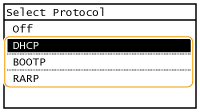 Select ⋖Off⋗. If you select ⋖DHCP⋗, ⋖BOOTP⋗, or ⋖RARP⋗ when these services are unavailable, the machine will waste time and communications resources searching the network for these services.