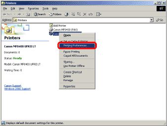 2. In the [Printers] folder (or [Printers and Faxes] folder), right-click the printer icon whose settings you want to configure -⋗ click [Printing Preferences] from the displayed menu.