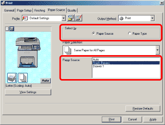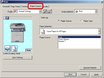 6. Make sure that [Paper Source] is selected in [Select by], select [Stack Bypass] in [Paper Source] and click [OK].