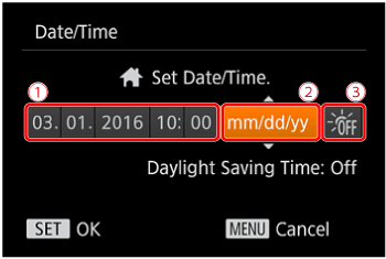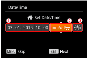 Set the current date and time correctly as follows if the [Date/Time] screen is displayed when you turn the camera on. Information you specify this way is recorded in image properties when you shoot, and it is used when you manage images by shooting date or print images showing the date.