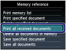 You can print all documents received in the machine's memory at once or select a document for printing on the Memory reference screen. You can also save the documents on the memory card or USB flash drive.