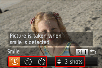 ( | The shutter will release approximately two seconds after the camera detects a new face. You can use this when the photographer wants to be in the image, such as a group photo. | - To stop shooting after the timer starts, press the < - If the camera cannot detect the face of a new subject that has entered the shot, it will shoot after about 15 seconds later. |