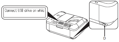 Connect the USB flash drive to the Direct Print Port (USB connector) (D) on the front of the machine, then press the OK button.