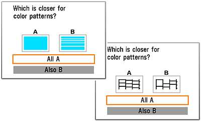 2. The confirmation screens for white streaks and missing lines are displayed alternately. Select the pattern that is closer to the nozzle check pattern that you printed.