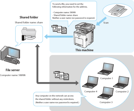 For the settings before using the Scan to File Server function (SMB) (related information), setting the IP address (related information), setting up a shared folder, and setting the machine for the Scan to File Server function are required.