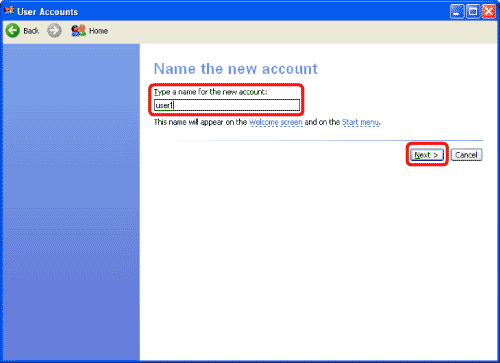 4. Type a user name in [Type a name for the new account], and then click [Next⋗].