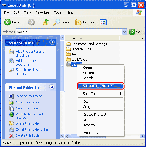 3. Select [Sharing and Security...] to open the [⋖Folder name⋗ Properties] dialog box.