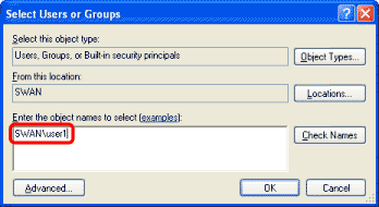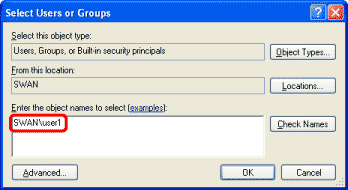 The [Name Not Found] dialog box appears if you enter an incorrect object name. If this happens, click [Cancel] to close the dialog box and check the computer name and user name.