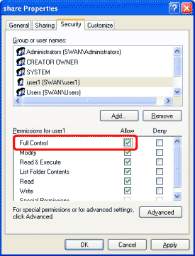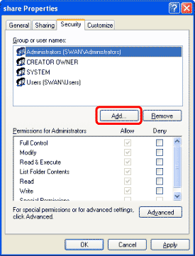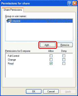 This section describes the procedure for granting FULL Control permission to the "Everyone" account so that any user can access the shared folder.