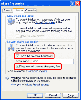 6. Select the [Share this folder on the network] and [Allow network users to change my files] check boxes.