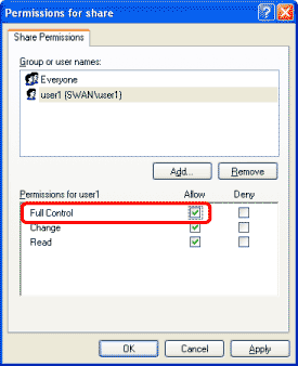 Select the [Full Control] box so that you can store data scanned with this machine on a computer (the file server).
