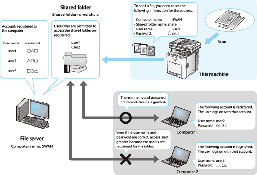 To access a shared folder of this type, users have account information (user names and passwords) for the shared folder. If they do not know their account information, they cannot access that shard folder.