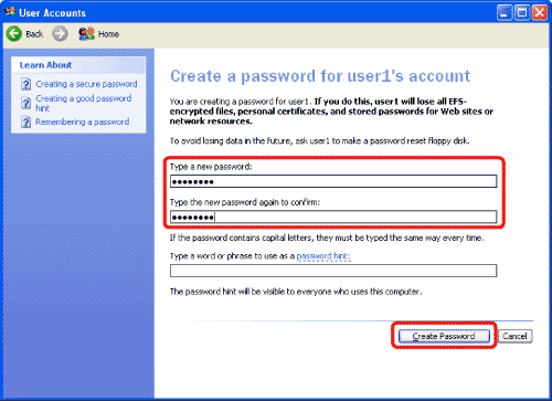 7. Type a password in [Type a new password] and [Type the new password again to confirm], and then click [Create Password].