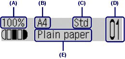 Here we confirm that 100% for Enlarge/Reduce (A), A4 for Page size (B), Plain paper for Media type (E), and Std (Standard) for Image quality (C) are specified.