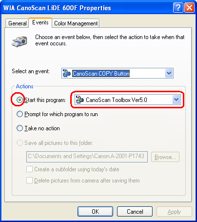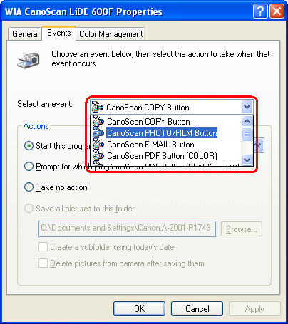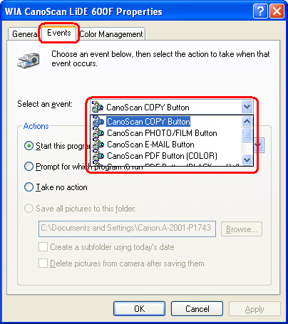 In the "WIA CanoScan LiDE 600F Properties" dialog box, select the [Events] tab.