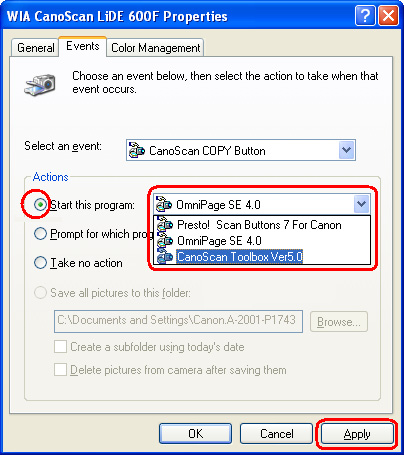 In the following example, CanoScan LiDE600F will be set to start Toolbox when a Scanner Button is pressed.