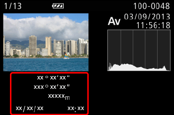 In the GPS information display, you can view still image and movie location information (latitude, longitude, and elevation recorded when [GPS] was set to [On] and the shooting date and time.