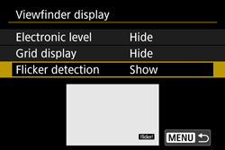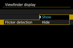 If [Flicker detection] is set to [Show] and [Anti-flicker shoot.] is set to [Disable], metering under a flickering light source will cause ⋖⋗ to blink in the viewfinder as a warning. Setting [Enable] before shooting is recommended.