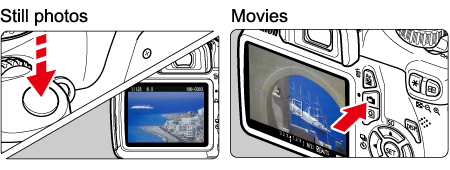 4. To shoot still photos, make sure that the camera is ready to take shots, and then press the ⋖ ⋗(Live View shooting) button. To shoot movies, set the Mode Dial to ⋖