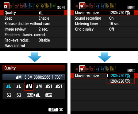 8. Select the image-recording quality for still images or the movie-recording size for movies.