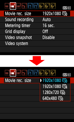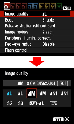 8. Select the image-recording quality for still photos or the recording size for movies.
