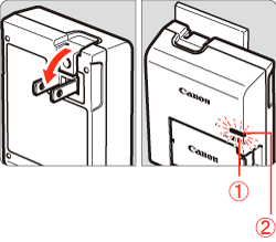 As shown by the arrow, flip out the battery charger's prongs and insert the prongs into a power outlet.