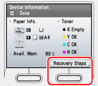 3. Press the right Any key to select ⋖Recovery Steps⋗ and follow the instructions on the display to replace the toner cartridge.