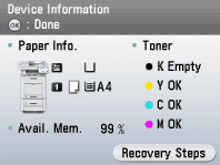 The Device Information screen shows in three levels the amount of toner remaining in the toner cartridges. If the screen indicates that the toners are empty, it is recommended that the toner cartridges be replaced.