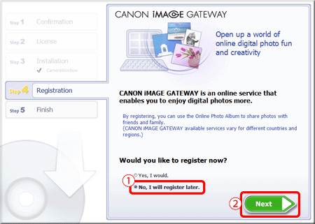 (To register in CANON iMAGE GATEWAY, select [Yes, I would] and complete the registration procedure.)