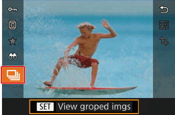 The six images from each shot are managed together as a group, and only the first image in the series is displayed during playback. To indicate that the image is part of a group, [ ] is displayed in the upper left of the screen.
