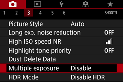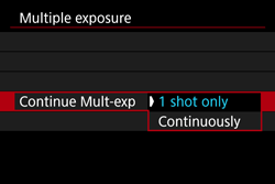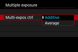 | Additive | The exposure of each single image captured is added cumulatively. Based on the [No. of exposures], set a negative exposure compensation. Refer to the basic guide below to set the exposure compensation amount. Exposure Compensation Setting Guide for Multiple Exposures: Two exposures: -1 stop, three exposures: -1.5 stop, four exposures: -2 stops |