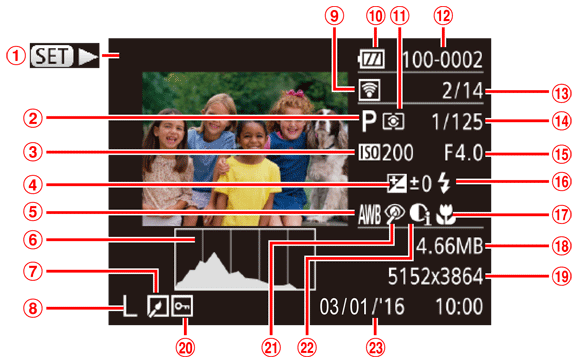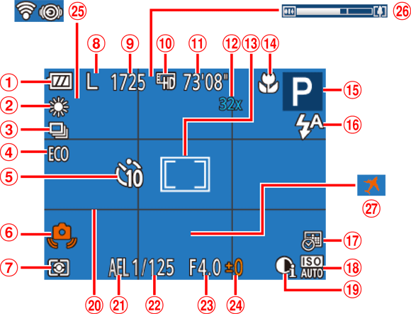 | Remaining time | Eye-Fi / FlashAir connection status | ||