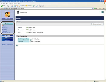 Click [Device] → select the item you want to display from the menu that appears under [Device].You can view the current status of the machine and also information about the administrator in charge of the machine, the installation location and various machine settings.