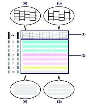 1.Check if there are no missing lines in the pattern (1) or no horizontal white streaks in the pattern (2).