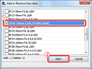 Checkmark the checkbox () for the lens used to shoot the image, and click the [Start] ( ) button.