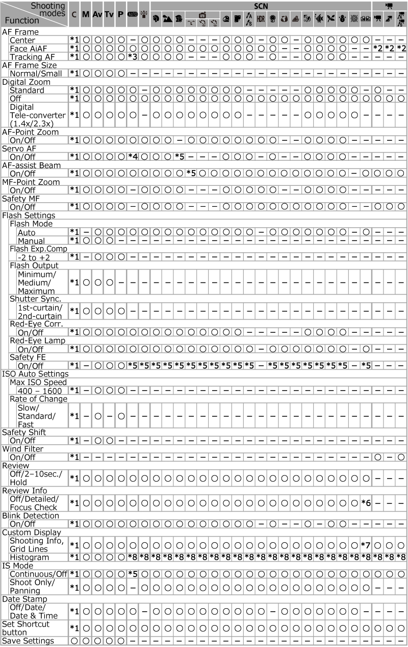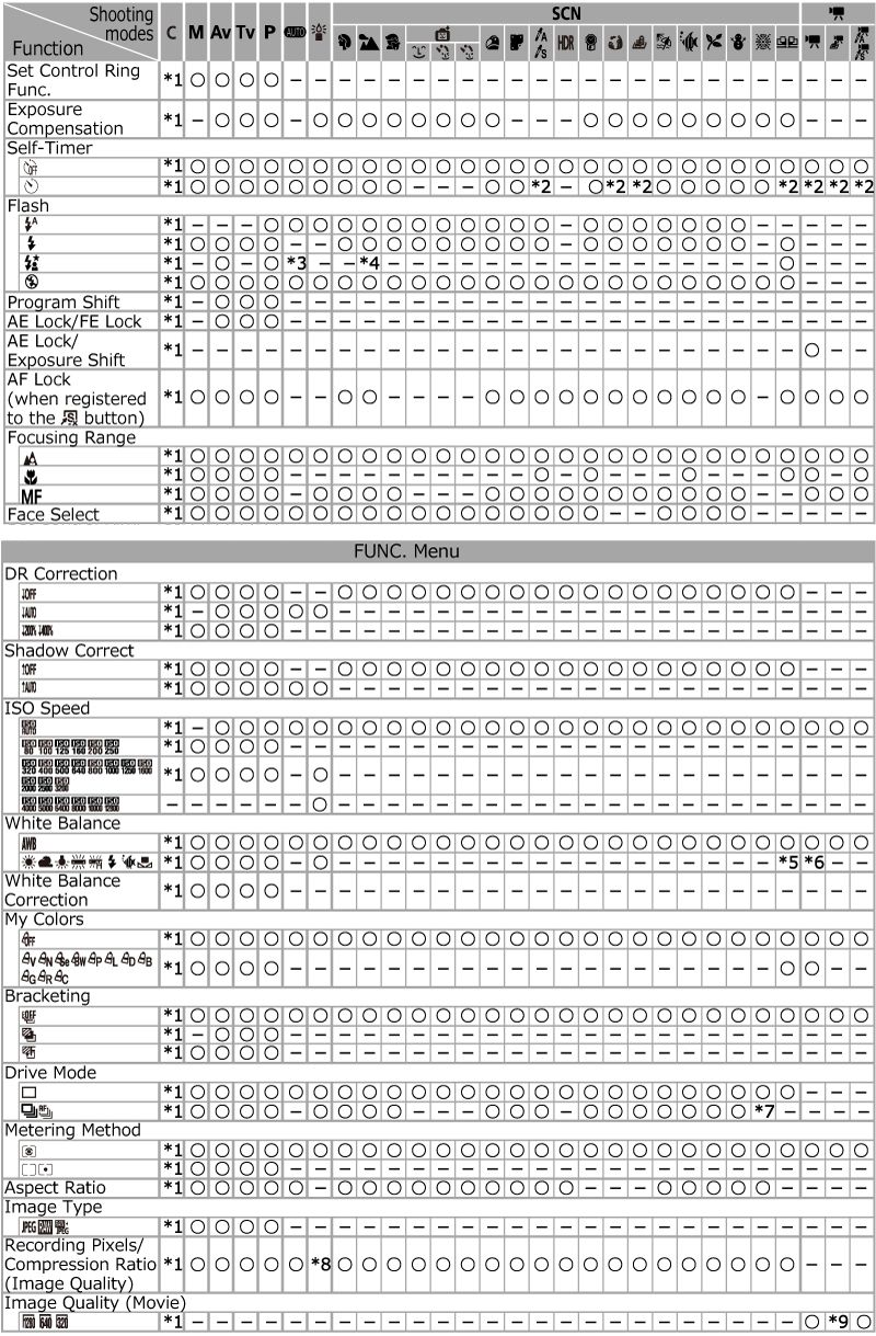 If you cannot set certain shooting functions, please check the current shooting mode of your camera. Some shooting functions may not be available in certain shooting modes. For details on the possible combinations of shooting functions and shooting modes, please refer to the following list.