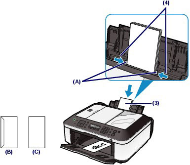(3) Slide the Paper Guides (A) to open them, and load the envelopes in the center of the Rear Tray WITH THE ADDRESS SIDE FACING YOU.