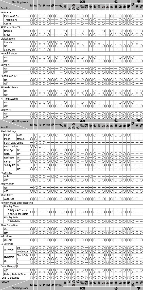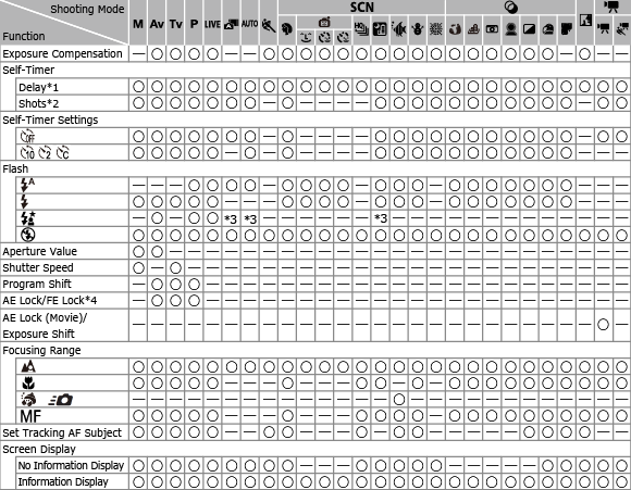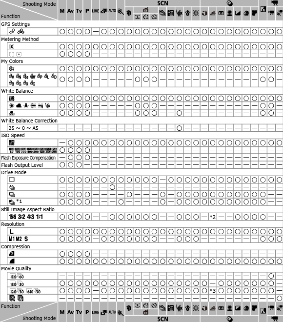 If you cannot set certain shooting functions, please check the current shooting mode of your camera. Some shooting functions may not be available in certain shooting modes. For details on the possible combinations of shooting functions and shooting modes, please refer to the following list.