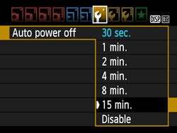 If [Disable] is set, either turn off the camera or press the ⋖DISP.⋗ button to turn off the LCD monitor to save battery power. Even when [Disable] is set, if the camera is not used for 30 min., the LCD monitor will turn off automatically. To turn on the LCD monitor again, press the ⋖ DISP.⋗ button.