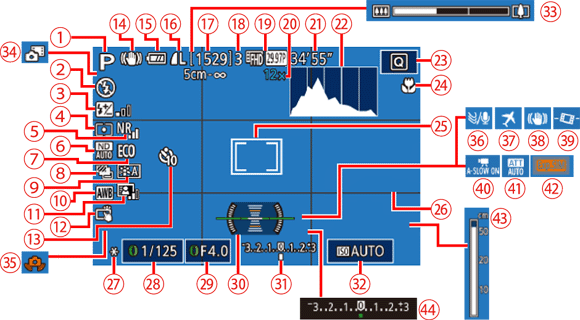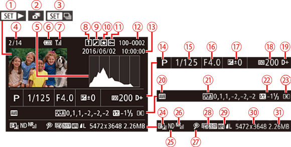 | Histogram | White balance correction, Picture Style setting details | ||