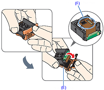 5. Remove the orange protective cap(E) from the Print Head and discard it.