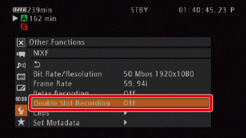 3. Select [w Other Functions] -⋗ [MXF] -⋗ [Double Slot Recording].